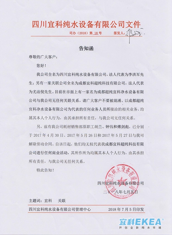 我公司全名為四川宜科純水設(shè)備有限公司,法人代表為李洪軍先生;另有一家關(guān)聯(lián)公司全名為成都宜科超純科技有限公司,法人代表為憂潔倪先生。目前在市面上有一家名為成都超純宜科凈水設(shè)備有限公司與公司無任何關(guān)聯(lián)關(guān)系,請廣大客戶不要被混淆。以成都超純宜科凈水設(shè)備有限公司為代表的任何業(yè)務(wù)人員所接洽的相關(guān)業(yè)務(wù),均屬其個人行為,由其承擔(dān)所有責(zé)任,與我公司無任何關(guān)系。