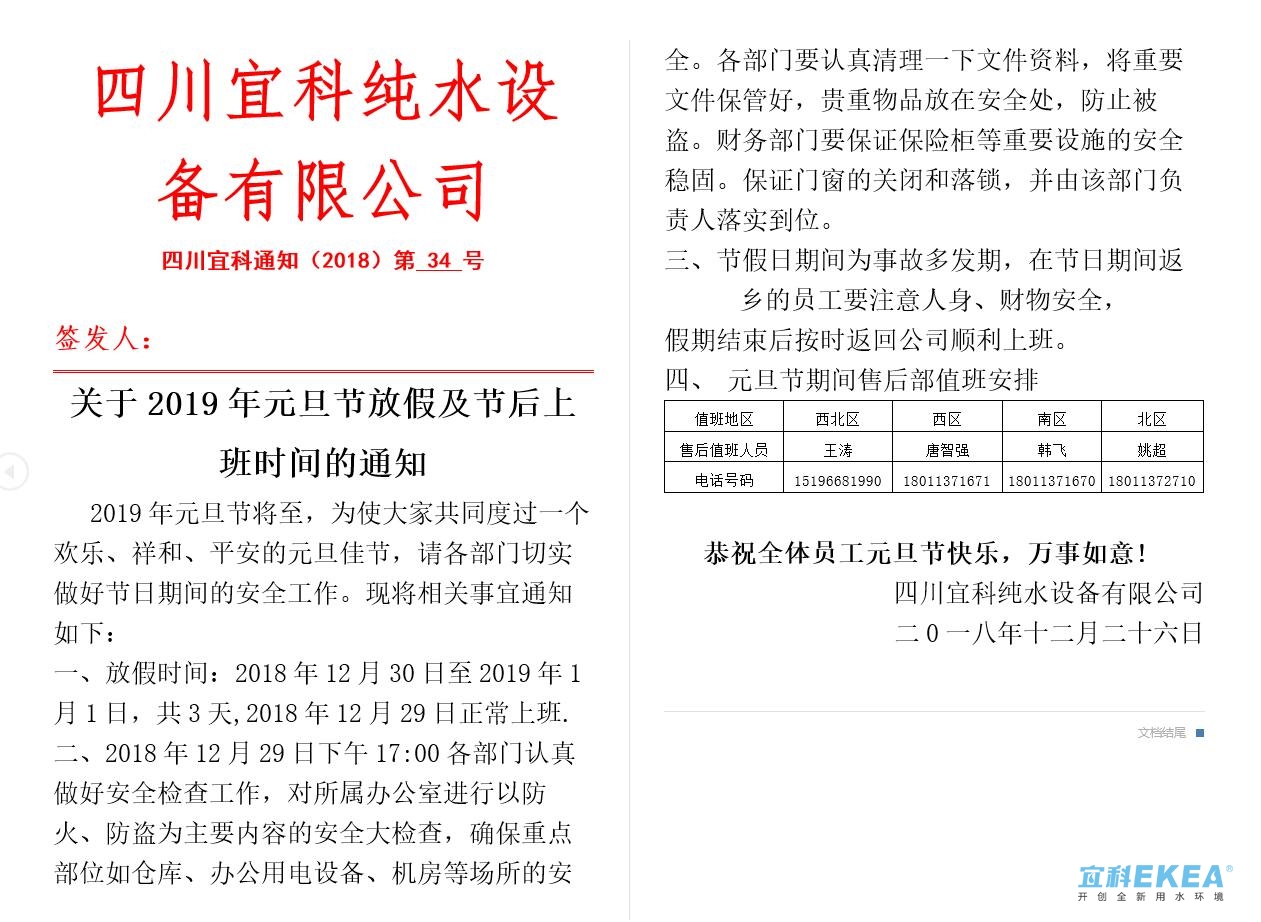 宜科純水2019元旦節(jié)放假通知