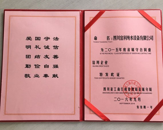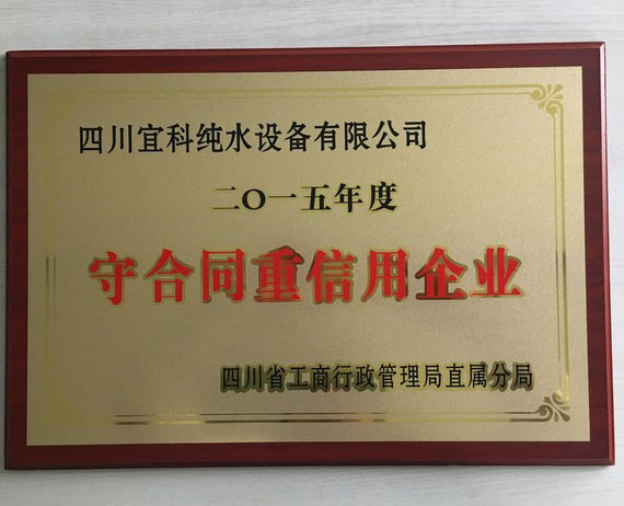 四川宜科純水設(shè)備有限公司成立之初,總經(jīng)辦領(lǐng)導(dǎo)就把商業(yè)信譽(yù)放在首位,提出守合同重信用是企業(yè)發(fā)展的原動(dòng)力,并且在商業(yè)活動(dòng)中一直秉持“以誠(chéng)為本,恪守信用”。事實(shí)證明,我們一直“光明”前行、不忘初心,被四川省工商行政管理局直屬分局評(píng)為二0一五年度省屬“守合同重信用”優(yōu)質(zhì)企業(yè)。