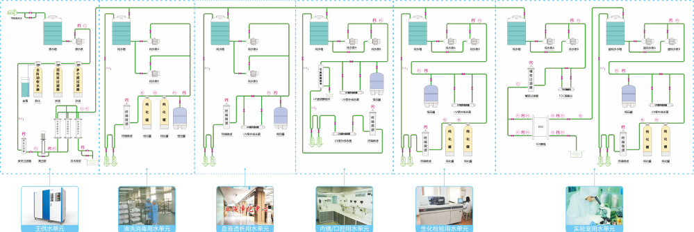 無(wú)論清洗消毒機(jī)、血液透析機(jī)、內(nèi)窺鏡、口腔設(shè)備、全自動(dòng)生化儀、實(shí)驗(yàn)分析等用水儀器是在一座大樓的同層或不同樓層,還是在不同的大樓,宜科均可配合最合理管路路徑與之實(shí)現(xiàn)無(wú)縫連接,通過(guò)管路同主供水系統(tǒng)相通,形成自動(dòng)循環(huán)完成水的初級(jí)處理和儲(chǔ)備,再通過(guò)各后處理系統(tǒng)完成水的分質(zhì)分級(jí)處理,滿足不同用水設(shè)備對(duì)水質(zhì)需求的不同。